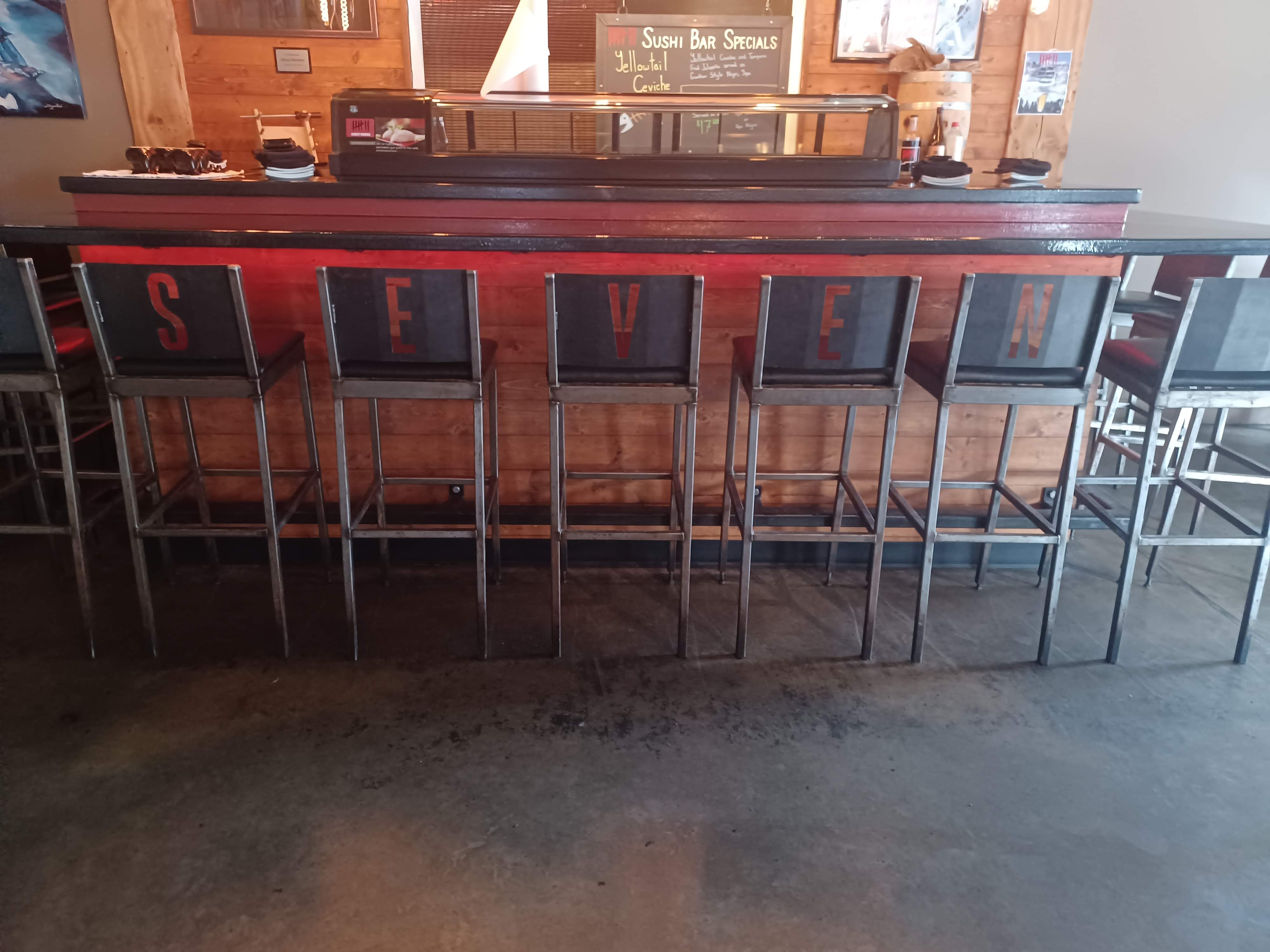 My dad and I went to lunch today at a new restaurant. It was my first time trying sushi. The restaurant had a tally mark logo. We asked our waitress where they got the name of the restaurant. She said that they weren’t sure but it could have come from a movie called seven, the seven deadly sins, or the seven samurai.The restaurant was really fancy and busy. Some of the bar stools spelled out the word seven which I thought was funny.