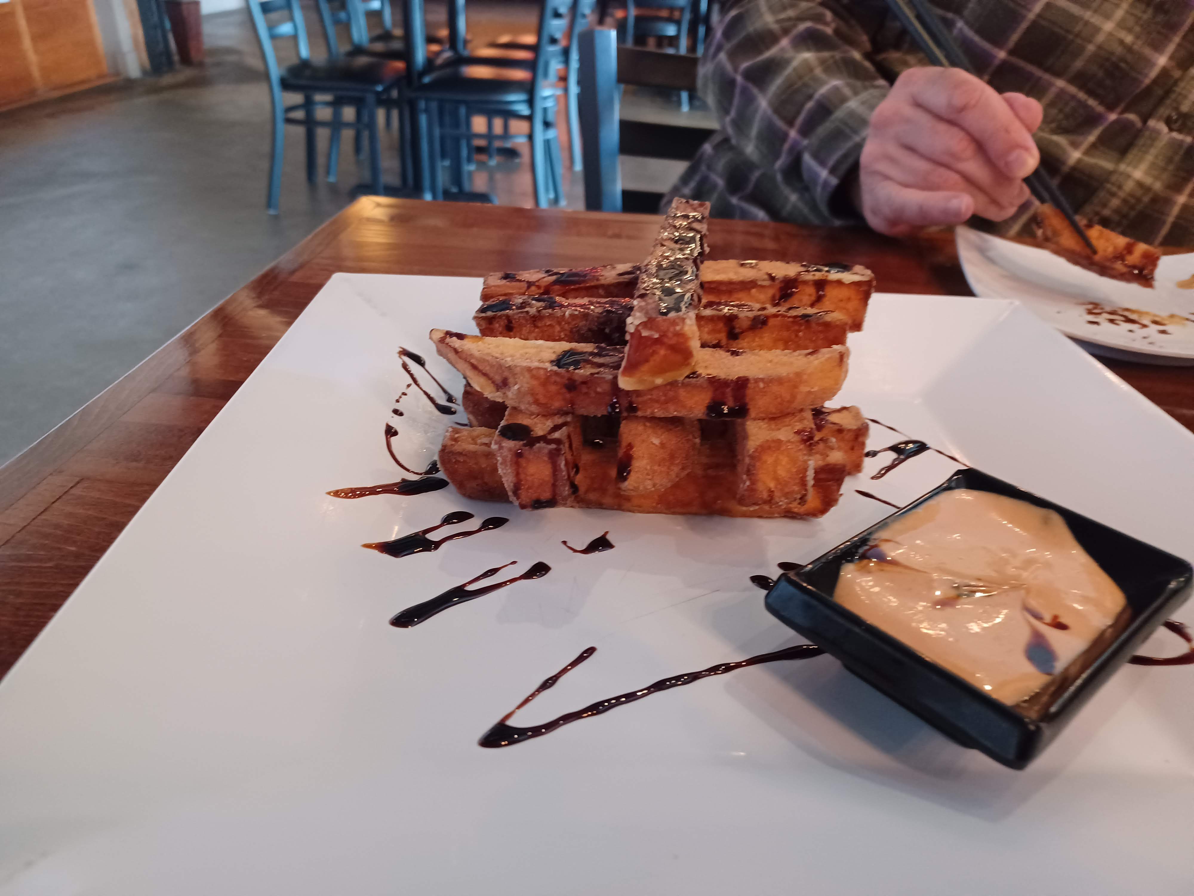 We ordered a appetizer of sweet potato fries with balsamic vinegar dipped in wasabi aioli. When the sweet potato fries came out they were stacked like Lincoln Logs. The vinegar added a sweet glaze and the aioli was a little spicy. Overall, the sweet potato fries were really good.