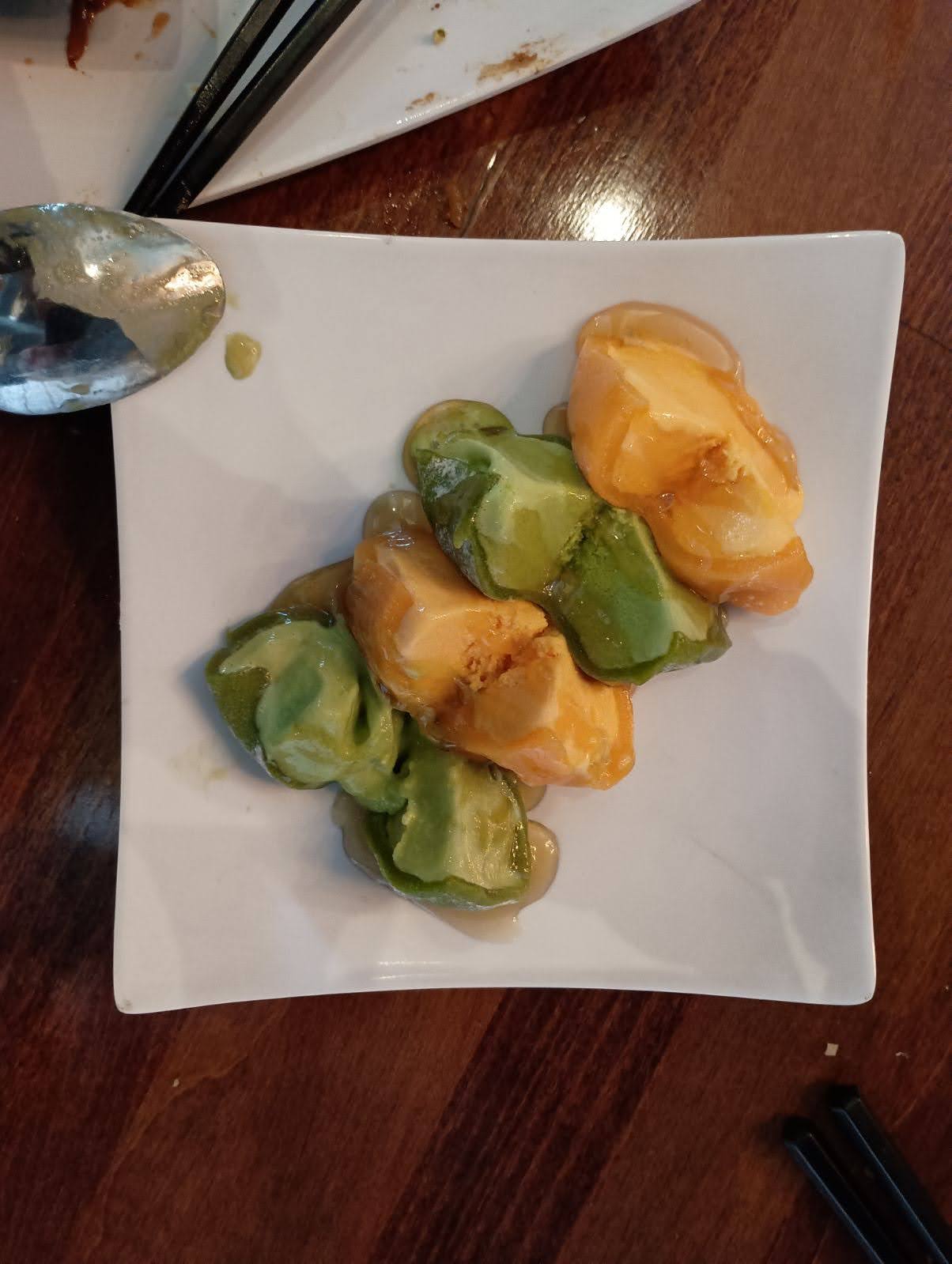 We also got dessert. We got Mochi which is a Japanese ice cream. They had a bunch of flavors but we ordered the green tea and the mango. The Mochi was cut into smaller pieces which you can see below in the pictures. The Mochi was drizzled in honey which tasted interesting and my dad said that he thought that the green tea and the honey worked well together.