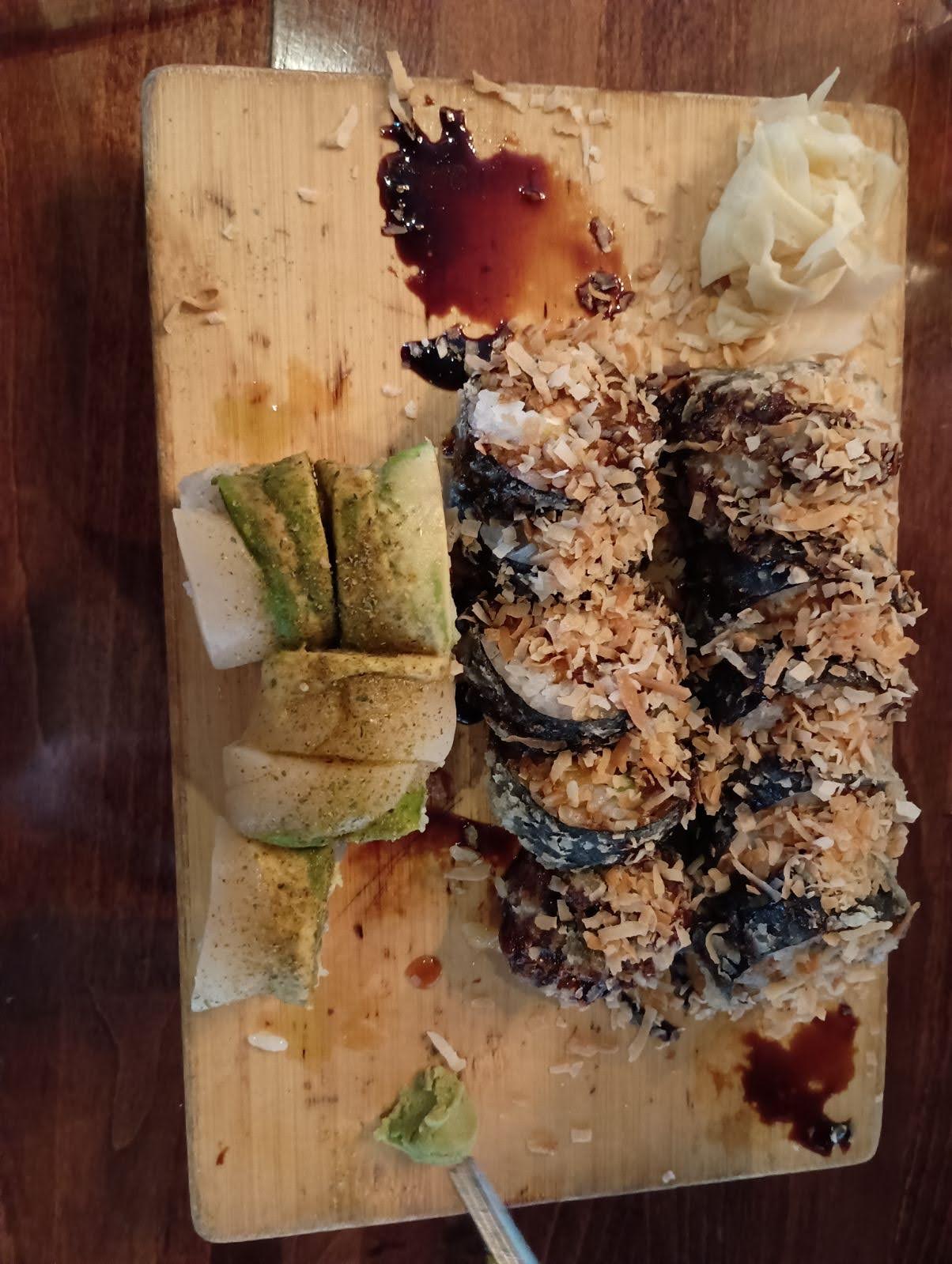 We also ordered 2 sushi rolls. We ordered a Ziggy Stardust with a seaweed outside, tofu, mango, tempura-fried and toasted coconut. I really liked the ingredients in the Ziggy Stardust and the seaweed tasted good. I also liked that the inside was warm and fried. The second roll that we ordered was a Green Dream with yellowtail, Green onions, and red bell peppers. It also came with soy sauce , wasabi and ginger. I thought that the Green Dream roll was interesting to try because I have never tasted yellowtail and this was my first time trying it.